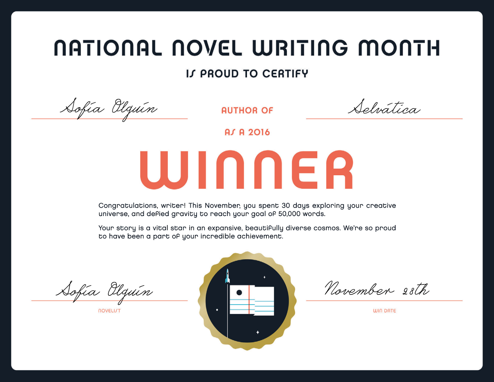 Muchas felicidades a todxs lxs que se hayan embarcado en el Nano, hayan ganado o no. Es una experiencia muy interesante :)