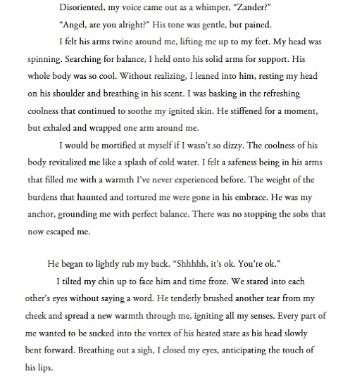 Justice,you know that this moment changes everything for Zander. If you haven't read it yet..., What are you waiting for!For Angel, being comforted in this moment is what begins the bind she has to Zander. As much as she feels she cannot trust him and should fear him, her heart and instincts tell her otherwise.What are your thoughts towards this scene?