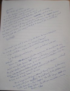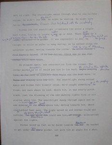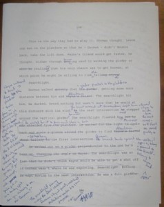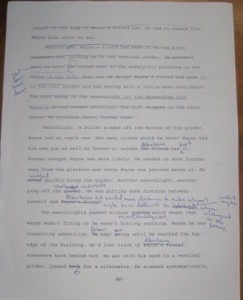 I've included images of three consecutive pages (including the back of one sheet) of the manuscript for my third book with my edits. These are fairly heavily edited and all 560-some pages don't necessarily look like this. You probably can't make out the actual words, but I think it gives you a sense of the degree of editing that goes in, even on a third or fourth draft.