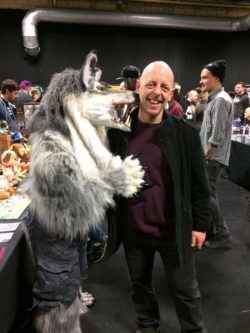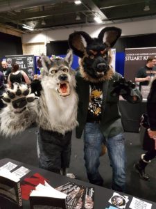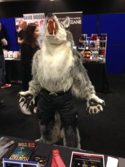 The shower ran mercifully warm that morning and an hour or so later we were in the taxi, heading to our first con as traders. I began the transformation to wolf form, pausing it only to munch on a bit of breakfast. Then it was time to go for a quick prowl and size up the queue of humans forming outside, charity collection tub clenched between my jaws.After picking out a few potential victims, I stalked back into the stadium and returned to our werewolf stall. There wasn’t much room between the tables for me to get in and out so I lurked to the edge of our pitch, growling and snapping at any humans foolish enough to get too close, and enjoying the odd skirmish with the zombies shambling through the crowds.