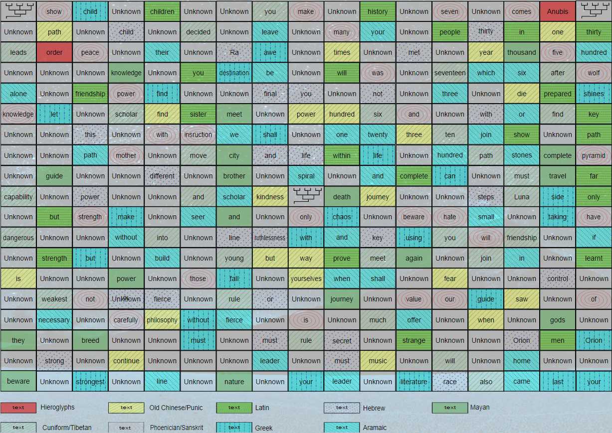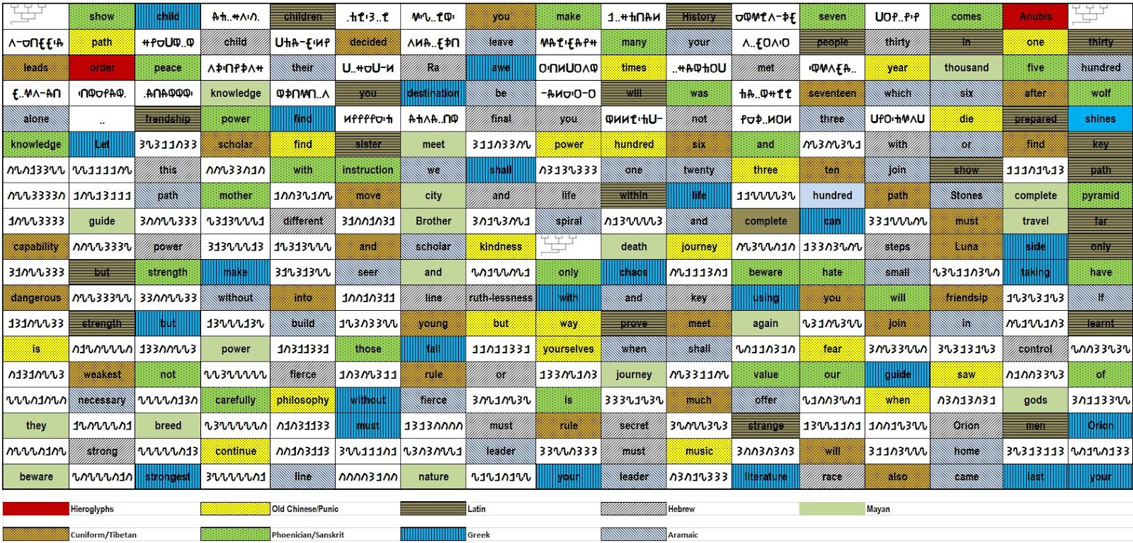 Words written in hieroglyphs can be read left to right or right to left. Find the direction animals face and read in that direction. In the message above the symbols making the words Anubis and Order face left.Words written in Phoenician never appear at the bottom of each 17 x 19 gridWords written in Old Chinese never appear at the left or at the bottom of the textWords written in...If you give up remember it remained unsolved for a thousand years AND you can cheat, because the solution is available in our book 'Stones, Stars and Solutions'.