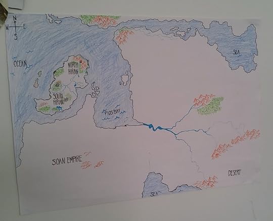 Setting aside a few rookie errors (don't think too hard about how rivers work, okay, you'll just be disappointed with me), I've created the landscape of the alternate world in which my countries of North and South Hiran exist.Most of the action takes place in North Hiran, which won its independence from Southern rule in the Battle for the Island Kingdom about 200 years before my story takes place. A fragile peace reigns between the two kingdoms, constantly under threat.