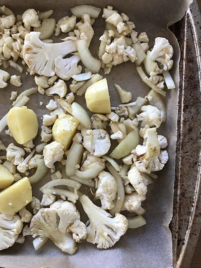 When you are ready to cook, preheat the oven to 425ºF. Line a sheet pan with parchment paper. In a bowl, toss the onions, cauliflower, and potatoes with the spices, oil, and salt (to taste) until everything is evenly coated. Spread the vegetables on the sheet pan and roast for 20 minutes.