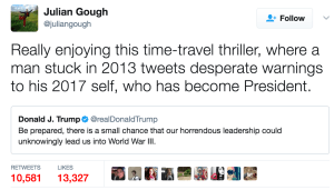 He scans the screen and his head droops, “I’m sorry sir, I miscalculated. Instead of tweeting to you in 2017 I tweeted to your 2013 self. Do you think you would listen to this warning in 2013?”