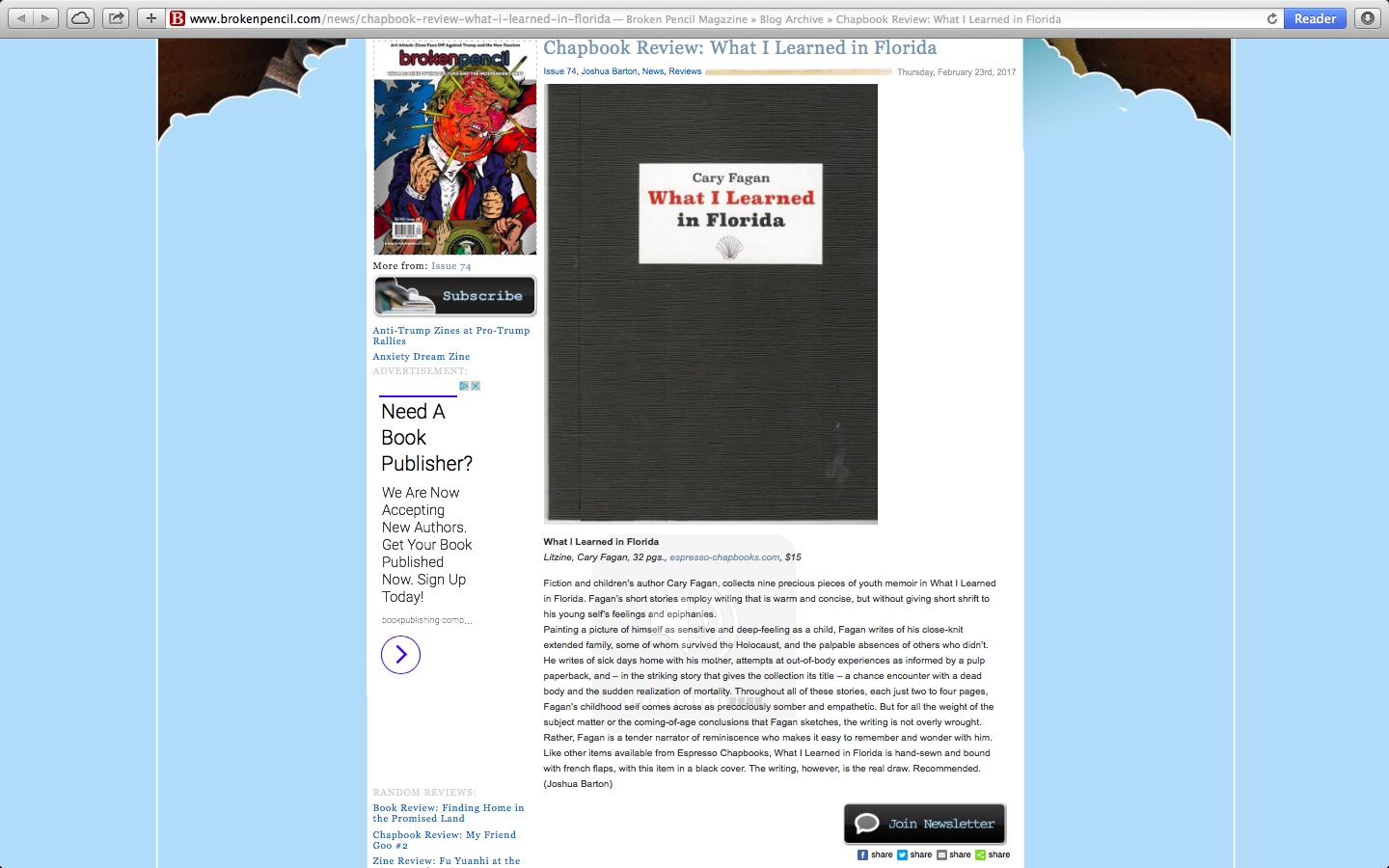 Here's a nice review of 'What I learned in Florida' in 'Broken Pencil.' Did someone ask whether copies were still available? Why, yes they are. **http://www.brokenpencil.com/news/chap...