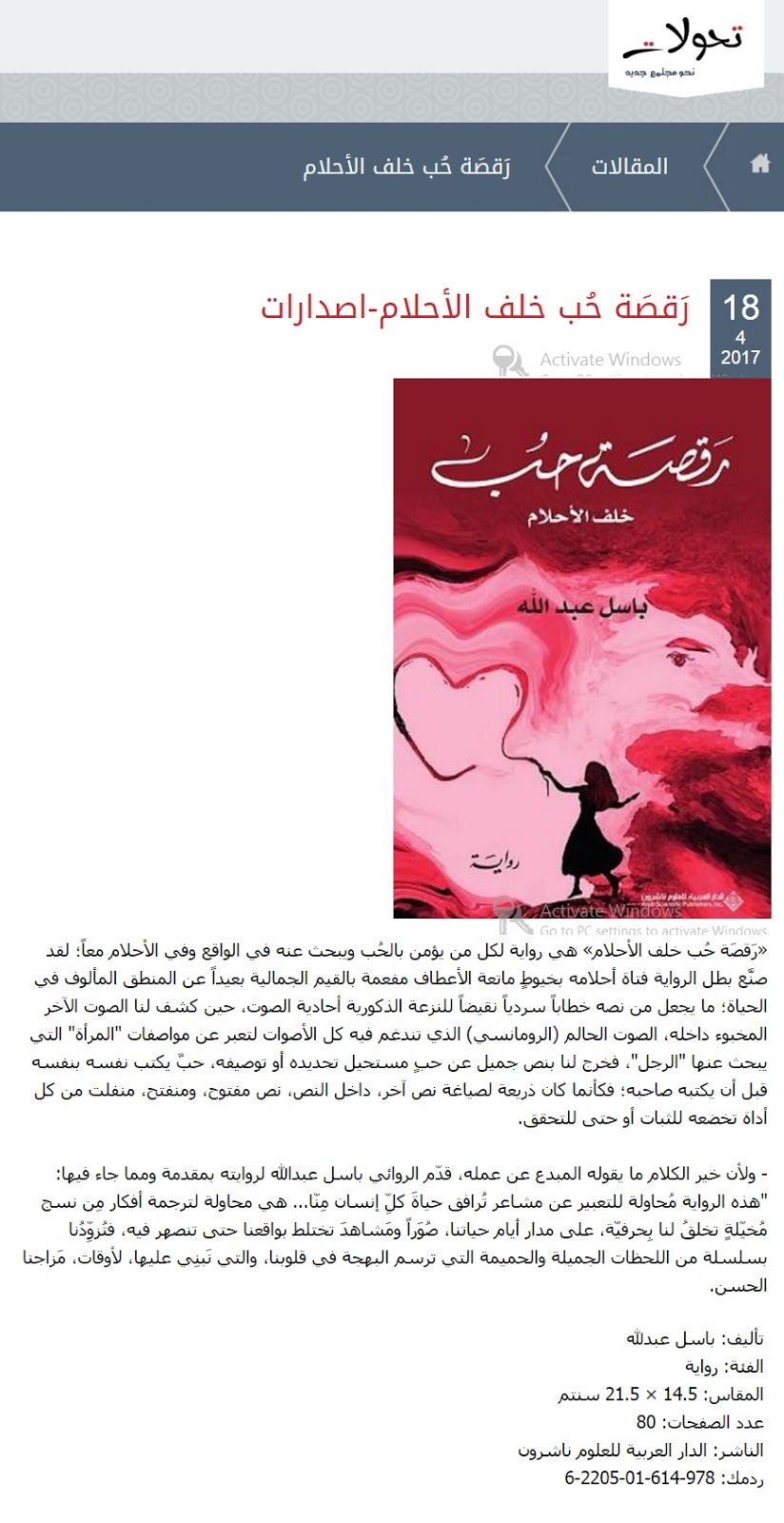 موقع دنيا الوطن 15-4-2017: صدور رواية "رقصة حب خلف الأحلام" عن الدار العربية للعلوم ناشرون