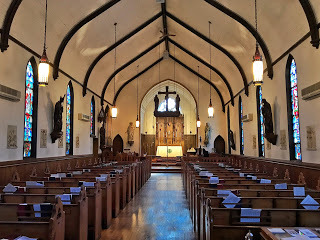 The sanctuary of St. Peter's before worship, yesterday.very night that he would be betrayed by a close friend, arrested, tortured and beaten, then the next day murdered. And he knew it was all coming. He told his friends what lay ahead, and even though they couldn’t grasp this reality, you can imagine the anxiety, confusion, and fear that must have filled the room in which they were gathered. This would have been a reasonable time for Jesus to bemoan his fate, perhaps hatch a getaway plan, maybe look for some sympathy or even pity from his friends. But this was not the case. He was thinking of their wellbeing. He says to them, “Do not let your hearts be troubled. Believe in God, believe also in me.” This is the Gospel text most often read at funerals, because it provides such comfort for troubled hearts. And it also tells us what the future holds for us, when we go to be with Jesus. Jesus says, “In my Father's house there are many dwelling places. If it were not so, would I have told you that I go to prepare a place for you?” Now, I’ve always preferred the old King James version of this text, “In my father’s house are many mansions …” because I think it better illustrates the kind of lavish love and the wonderful homecoming we can expect when we die.