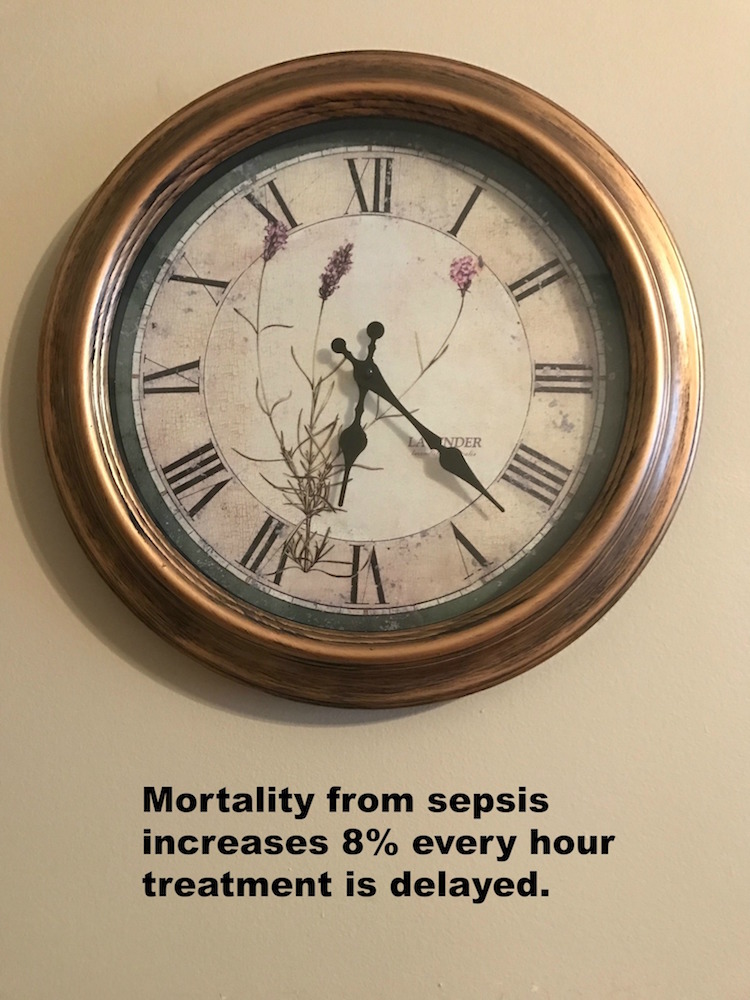 Sepsis isn’t always preventable, this is true, but early detection and treatment often prevents it from progressing to severe sepsis and septic shock. A couple of years ago, I saw how effective a sepsis protocol can be. A family member who had a stroke was diagnosed with endocarditis while in the ICU. He showed the classic signs of sepsis onset and the staff was all over it, preventing more complications. Research has shown that for every hour patients with severe sepsis aren’t treated, their chance of survival drops by 8%. Like stroke and myocardial infarctions, there is a “golden hour,” during which immediate treatment can mean the difference between life and death.