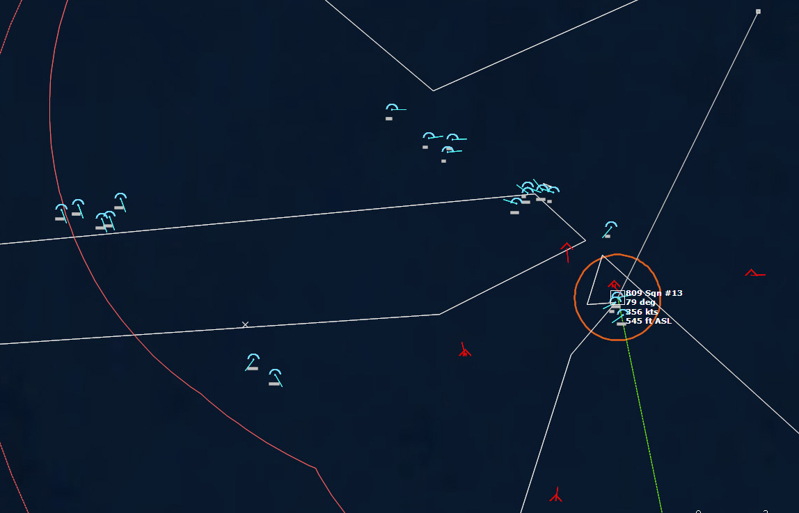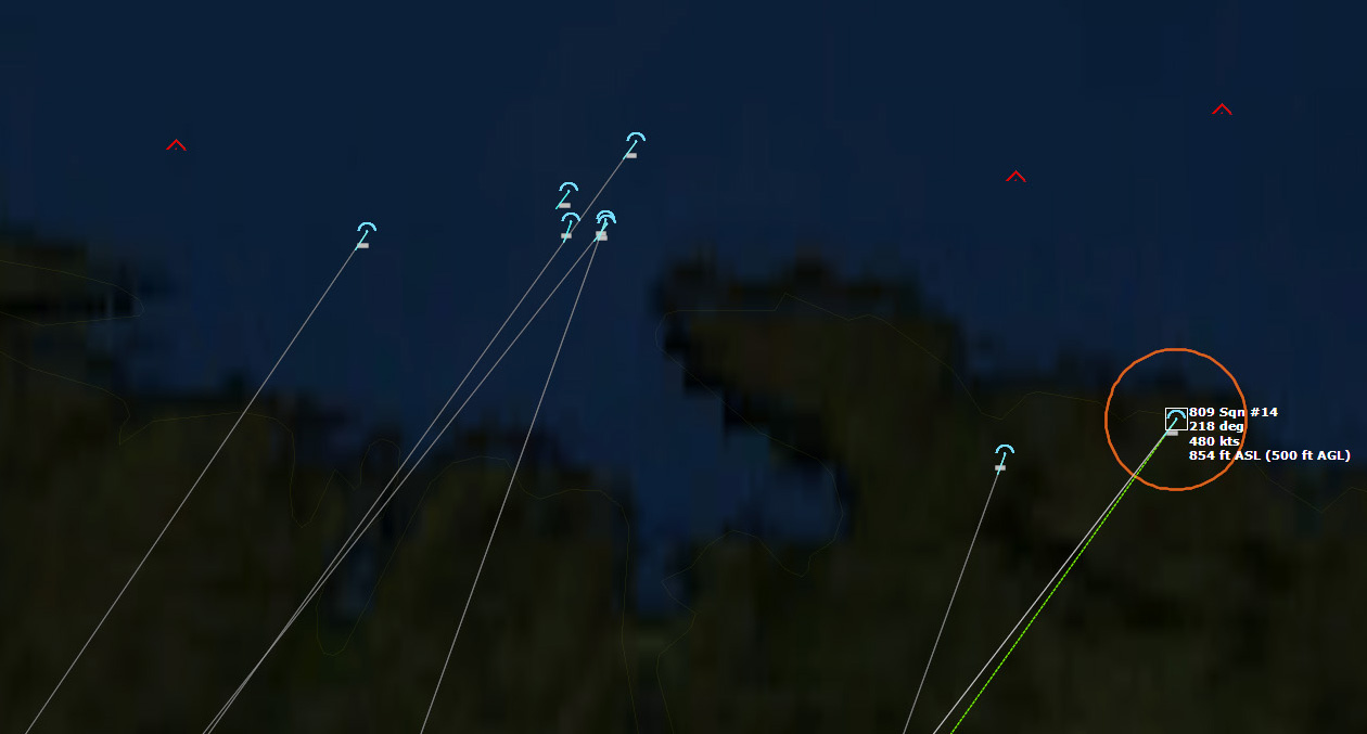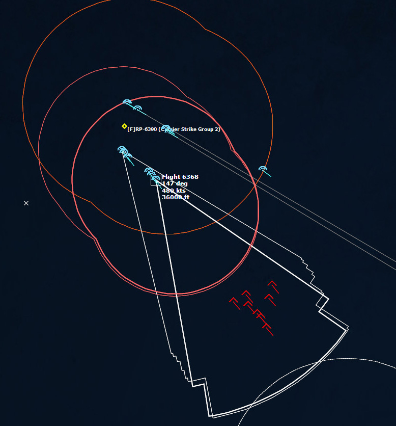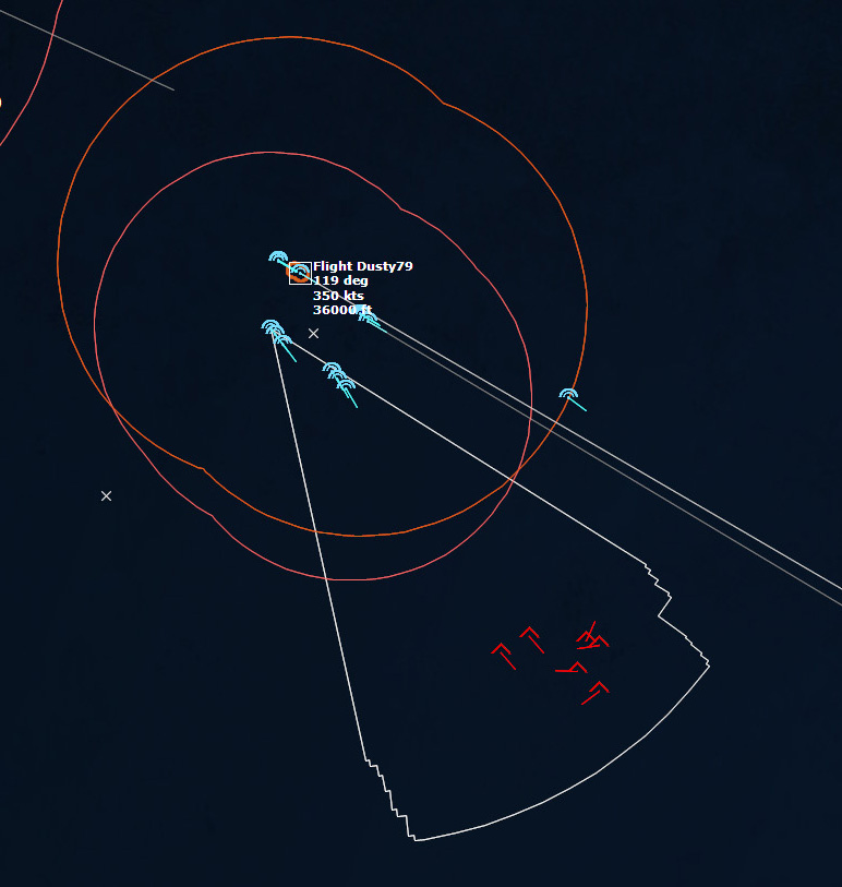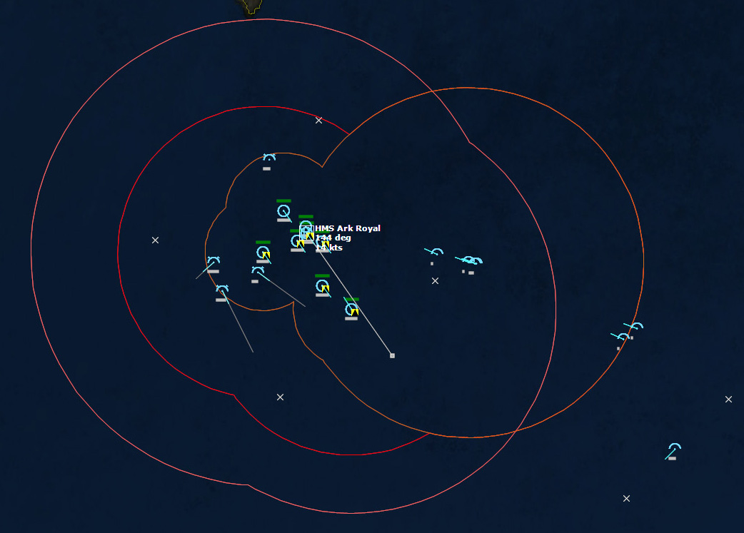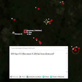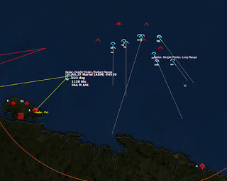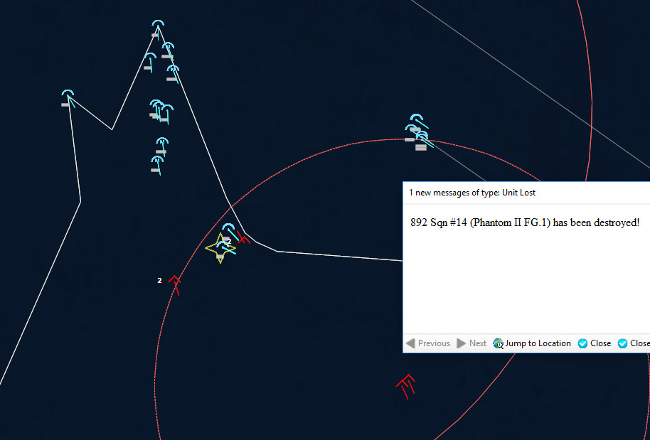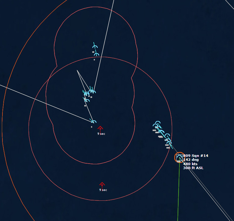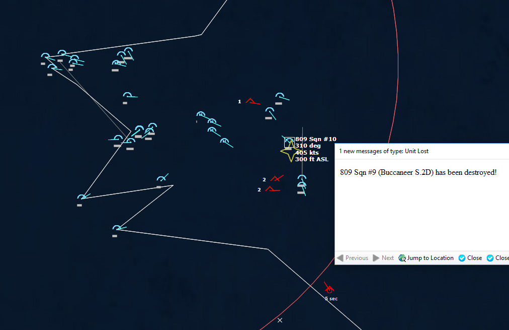 So after that debacle, I opened a previous save from just before the Buccaneers went feet dry. This time I micromanaged the hell out of them, updating and plotting courses for each individual aircraft frequently to ensure they would stay as low as I could keep them. I would let the simulation run for maybe 5 seconds, then check each aircraft to make sure it was doing what I told it to, give it new orders if it was misbehaving, and then let the sim run for another few seconds. I had to do this for the entire attack run.  Even so, two of my Buccaneers decided to go ballistic for no apparent reason and got shot down for their trouble.
