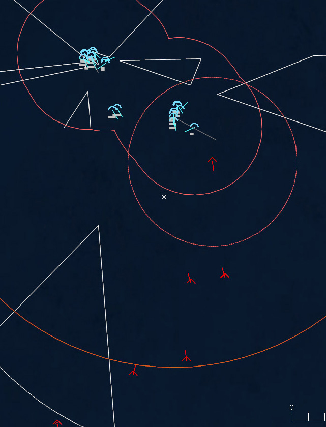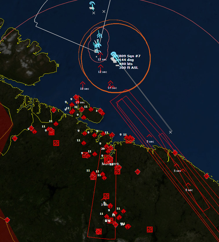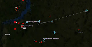 The Severomorsk-1 Strike is 40nm away from its target, and the Olenegorsk Strike is 63nm away. The Soviet interceptors still attempt to shadow the Buccaneers, but are unable to attack them.