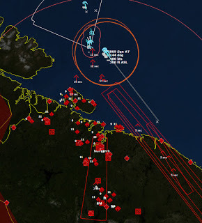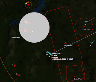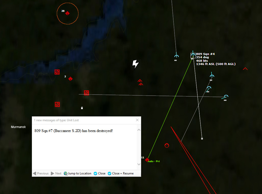 To the south, the Olenegorsk strike still deals with SAMs. The escorts are out of Martels, and so head for home. It's up to 809 Sqn #14 to go it alone.  The Buccaneer dodges unbelievable amounts of SAMs as it bobs and weaves its way towards Olenegorsk Airbase.