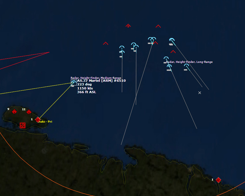 The escorts begin shooting AS.37 Martels to take out the radarsAs the strike closes in, the SEAD escorts begin launching Martels to take out radars on the coast.