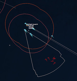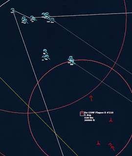 To prevent them from burning up too much fuel, I slow my interceptors to cruise, and I set my strike package to loiter to give the interceptors time to get a little lead.  I also start decreasing their altitude in the hopes of keeping them from being detected a little longer.