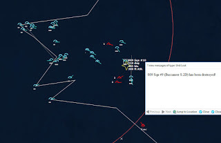 Missiles inbound on the strike package!The first salvo of missiles miss. The second doesn't, and one of my ARM armed Buccaneers is shot down.