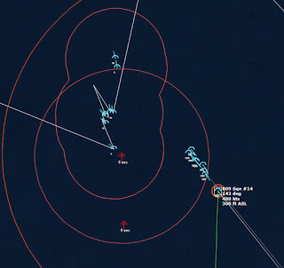 Fiddlers attempt to intercept.The Fiddlers pass, but have difficulty engaging the strike so low. Four Fiddlers chase the package, but seem unwilling to descend below 1500 ft.  Then a Su-15 Flagon shows up. Although it descends to 300 feet, it still doesn't launch any missiles. Fortunately their radars are not "look-down shoot-down", so they can't engage the Buccaneers amidst the ground clutter.