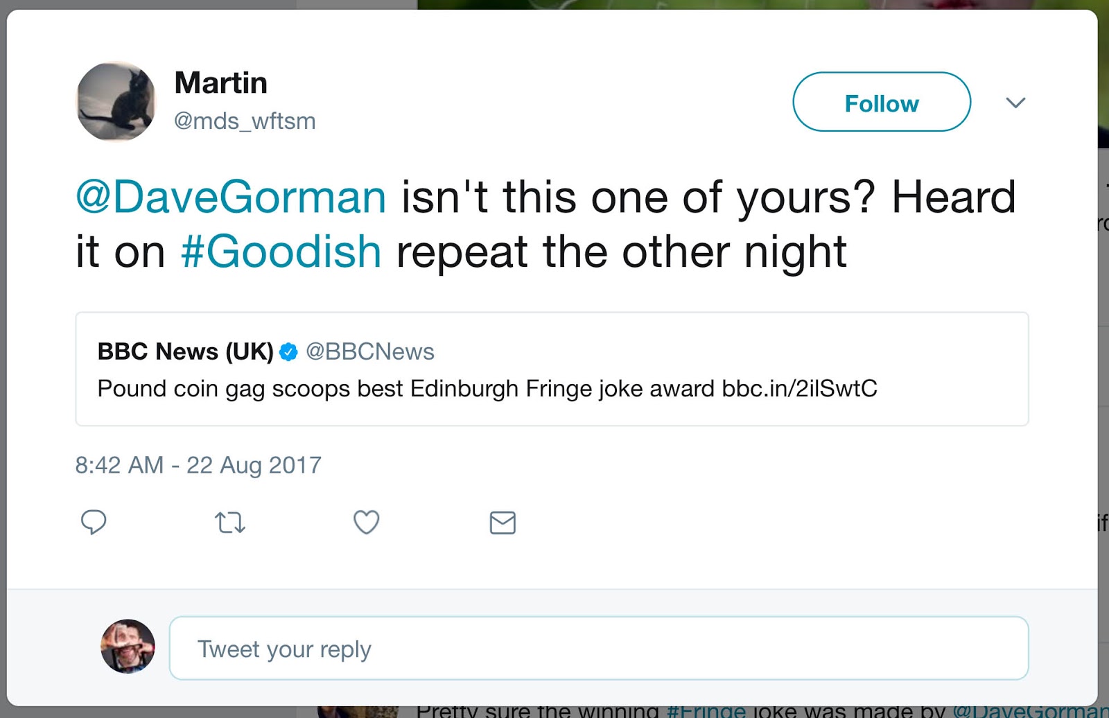 But of course I don't expect everyone to have a 100% recollection of the show and the way in which every word was said. And so a lot of people who had seen the show had a vague recollection that I'd once said something about the new pound coin and the fear of change and then they read the story about the prize and suddenly I was receiving dozens of tweets from nice people saying things like this...