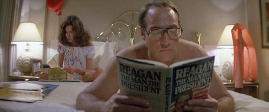 I am so confused as to why that particular element was included in this movie. It's not referenced again. It's not a story element; it's not like Mom and Dad's reliability is ever questioned later on (you know, in a "They're potheads, so maybe they didn't actually see a ghost!" way). So why was it included? Why not just have Mom and Dad have the exact same scene together while not smoking pot? Is it the filmmakers displaying their own warped notions of homelife by implying that "That's just something ordinary folk do! They smoke pot while they're relaxing at the end of the day!" ... Or is this a very clumsy way of the filmmakers going, "See, they used to be hippies, hence the pot, but now they're squares -- hence, the Ronald Reagan book." And Mom does have a moment, later on, when she says to Dad after she first notices the weird happenings in the house, "Think back to when you were open-minded," or something to that effect.
