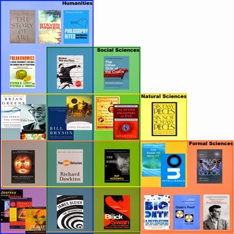 Below are the list of the books and their authors:The Story of Art; Enrst GombrichThe Language Instinct; Steven PinkerPhilosophy Bites; David Edmonds, Nigel WarburtonFreakonomics; Steven D. Levitt, Stephen J. DubnerBanksy Wall and Piece; BanksyThe Other Side of the Couch; Gary Small, Gigi VorganFabric of the Cosmos; Brian GreeneThe Universe in a Single Atom; Dalai LamaA Short History of Nearly Everything; Bill BrysonGuns, Germs and Steel; Jared DiamondLongitude; Dava SobelSeven Daughters of Eve; Bryan SykesSix Pieces, Six Not so Easy Pieces; Richard FeynmanGodel, Escher Bach: An Eternal Golden Braid; Douglas HofstadterThe God Delusion; Richard DawkinsThe Singularity is Near; Ray KurzweilThe Road to Reality; Roger PenroseOn Intelligence; Jeff HawkinsChaos: Making a New Science; James GleickJourney Through Genius; William DunhamFermat’s Enigma; Simon SinghPrime Obsession; John DerbyshireThe Information; James GleickThe Black Swan; Nicholas Nassim TalebBig Data: A Revolution; Viktor Mayer-Schönberger, Kenneth CukierGodel’s Proof; Ernest Nagel, James R. Newman, Douglas R. HofstadterTractatus Logico Philosophicus; Ludwig WittgensteinPS: I used the below categorization for each of these sets:HumanitiesHistoryLinguisticsLiteraturePerforming artsPhilosophyReligionVisual artsSocial sciencesAnthropologyArchaeologyArea studiesCultural and ethnic studiesEconomicsGender and sexuality studiesGeographyPolitical sciencePsychologySociologyNatural sciencesSpace sciencesEarth sciencesLife sciencesChemistryPhysicsFormal sciencesComputer sciencesLogicMathematicsStatisticsSystems science