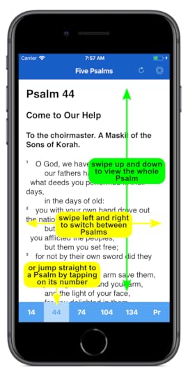 The following screenshot contains just about everything you need to know about “Five Psalms.” When you open the app you see a page like the one below. This screenshot was taken on the 14th of the month. Notice all five “Psalms of the Day” at the bottom. You can either tap on them one-by-one or swipe to the left to see the next one.