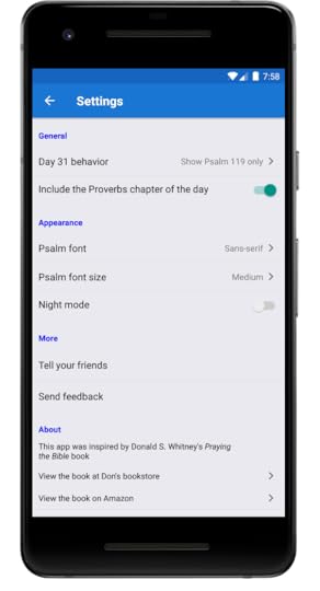 On the Settings page (see below) you can choose between Psalm 119 on the 31st, or five random psalms. You can even choose to have the app display the chapter of Proverbs for the day. For more than 40 years I have been reading the chapter of Proverbs that corresponds with the day of the month (that is, there are 31 chapters in Proverbs, one for each day of the month), so I really appreciate this option.