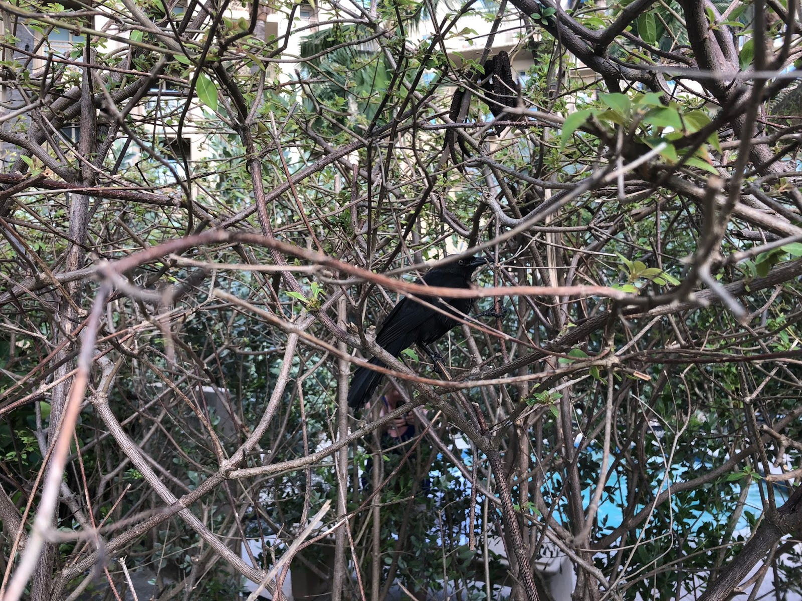 On the way to her demo, a grackle in a nearby bush decided to announce her/his presence.