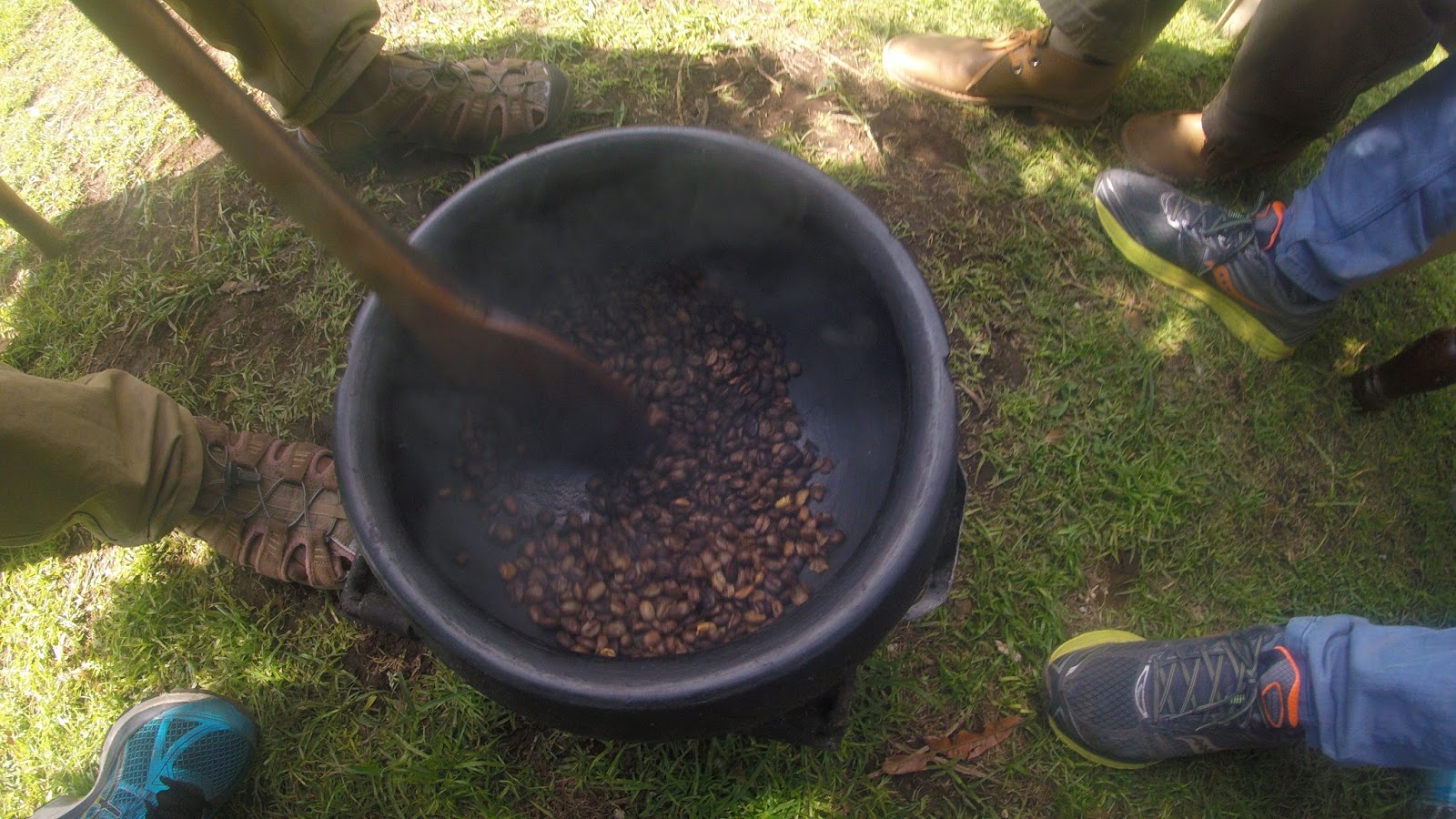 Using an age-old technique for getting the beans to a medium roastFor the rest of the trip, my highlights were the rainforest days at the beginning and end - where we encountered monkeys and a civet. My favorite climbing day was the famed Barranco Wall - I could've gone back down and done it again. My favorite plants were found in the same climate zone as the wall - the giant senecio https://en.wikipedia.org/wiki/Dendrosenecio and the lobelia deckenii https://en.wikipedia.org/wiki/Lobelia_deckenii The Lobelia, in particular, is a fascinating plant. It holds a large amount of water in its open leaves during the day. So much so that, in fact, you can scoop out water with your hand. The plant shuts back up completely at night in order to protect itself from freezing. As it ages, it grows a large flowering top with hundreds of buds in little cave-like enclosures that attract bugs. The bugs in turn attract birds, and the birds both help pollenate and repopulate the plant - making for a true symbiotic relationship.