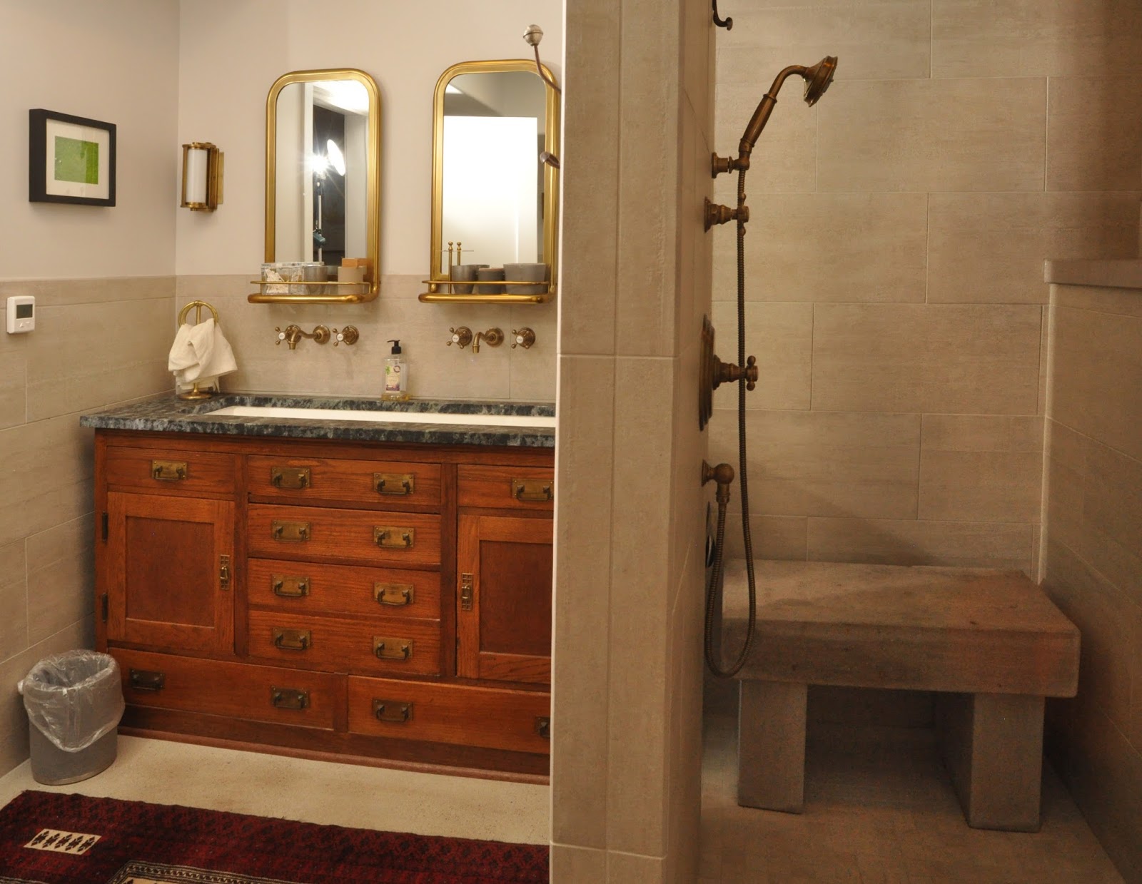 Guests really like this bathroom, with the giant soaker tub and walk-in shower.  I love the long Wetstyle trough sink, which gave us the functionality of separate faucets without the look of two bowls, which isn’t my favorite.