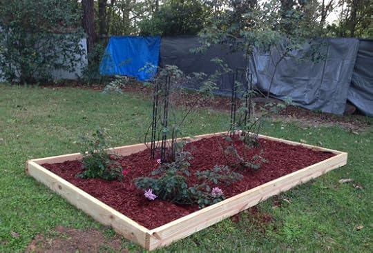 In the garden: I’m sooo glad it’s spring. The thing I hate most about winter is I don’t get to play in the dirt. We bought this house 3 years ago but I haven’t had much chance to really work in the yard. Last week, I tackled the roses. I wish I had a before photo. Anyway, the house was unoccupied for a couple years before we bought it, and the yard was seriously neglected. We spent the first couple summers just clearing out brush. Last year I got a start on my veggie garden. Last week–the roses. There were 4 surrounded in a circle by monkey grass. I hate that stuff and mowing around it is a pita. These roses are also oddly placed in the yard. They get full sun which is good but they’re kind of on a slope. So I could dig them up and move them or build a bed around them. I love roses so no brainer. This is what I have now. Ignore the tarps in the background lol.