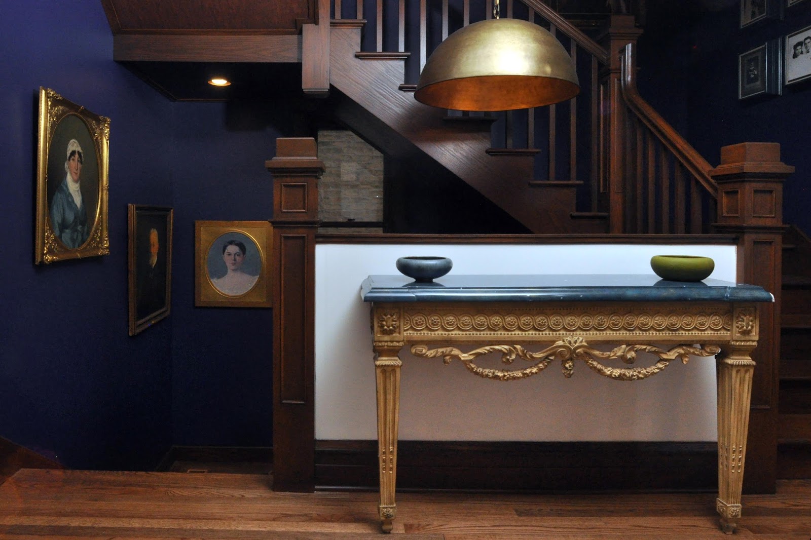 When it came to our part, we had one major design element to address. Way back, in the beginning, I had said to my Charming Suitor that the grand staircase is usually where the chateaus and manor houses hang all those gilt-framed oil portraits of the ancestors. He asked politely if I had any of those lying about, which I had to confess I did not. He was equally bereft of Old Masters capturing his people back in the day. But we both loved the idea. So we started collecting other people’s ancestors to hang in the stairwell. We were going to need a backdrop color that really highlighted them, and we knew we wanted some real depth of color in the stairs, and CS suggested eggplant purple, which is my favorite neutral. It just goes with everything. The color, Majestic Purple from Sherwin-Williams, really shows off both the stairs themselves and the artwork to great effect. On both the first floor and second floor we installed these gorgeous console tables that were a gift from dear friends. They are the perfect spot to drop the little items we are forever moving from floor to floor. We topped it off with a large brass dome pendant light.