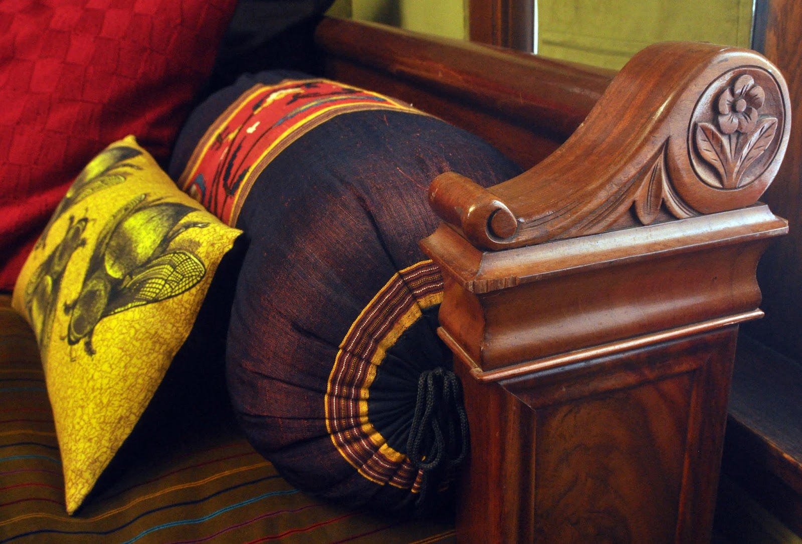This is my office, the main highlight of which are the walls, which my bestie Rachel and her husband upholstered in moss green velvet. It makes the room super cozy, and deadens all outside sound. I confess to doing most of my work on the antique daybed. I schlepped the stripe fabric back from Paris, and our upholstery guru Beth Laske-Miller made the cover for the mattress. The antique hospital bed table works wonderfully for my laptop. But despite working mostly on the bed, I do love my desk. The piece is from the 1830s, and has all the fun cubbies and hidey-holes that anyone could want.