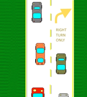 So here we see a road. The right lane has been clearly marked as being a right turn only lane. Signs have been posted several blocks back, informing drivers of this impending condition. It is not a surprise. However, since traffic slows down in this spot due to the road going from two lanes to one, people get impatient.