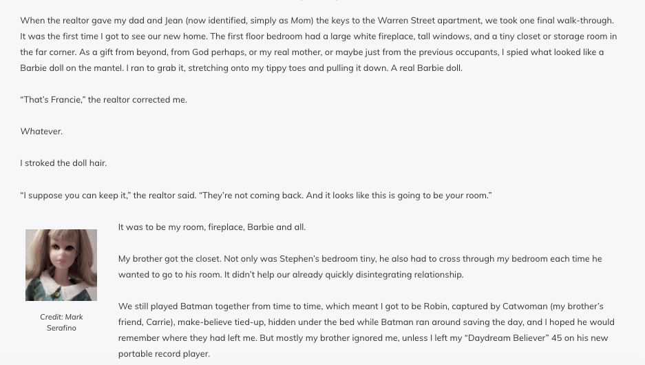 I missed my sister terribly. If I had ever felt whole, it would have been like having an arm cut off, or an eye taken out, but to be honest, at this point, I was pretty used to operating with fewer cylinders, less gas, a flat tire or two. I still had my bike, my body, and now, a whole dairy farm spread out in front of me. Cornfields to run through, a flat country road that ran along the river to explore, the town library where I could take out books as often as I could ride my bike there. And food, like ice cream, readily available. But Anne’s visits were hard for me. I can’t think of explaining it any other way, except for this: Imagine someone you loved very much and expected would be in your life forever suddenly dumped you, letting you know you were just about the most unlovable, worthless human on earth. However this person who dumped you, didn’t dump your sister. So every time your sister comes to visit, you know she is going to go back to be with the very person who didn’t want you anymore. But still wanted her. And then you would have it. Sort of. Until Anne’s mother dumped her, too. But not exactly. Because this is where stories can collide and can actually explode, showering down with shards of glass that cut and wound deeply but never reflect the whole truth, only slivers of it. My father will say that Jean had a boyfriend who was moving to California and didn’t want Anne anymore, so she set up a situation whereby he had to go to court and sue for full custody. And Jean will say that my dad wanted Anne to live with him, had more money and more resources, sued for full custody in family court, and won. My dad will say it was becoming so clear that Jean was an unfit mother he had to sue for full custody to protect Anne. Jean will say he dragged her through the mud, with lawyers and even the testimony of his new blond, perky wife, Barbara, and that she had no other choice but to move to California with her new boyfriend, Alvin. And have another baby.