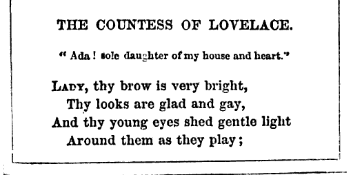 And finally, I can't tell you how pleased I am to present this Ode To Lady Lovelace, whose agonizing awfulness will quite diminish by contrast the awfulness of my own verses: