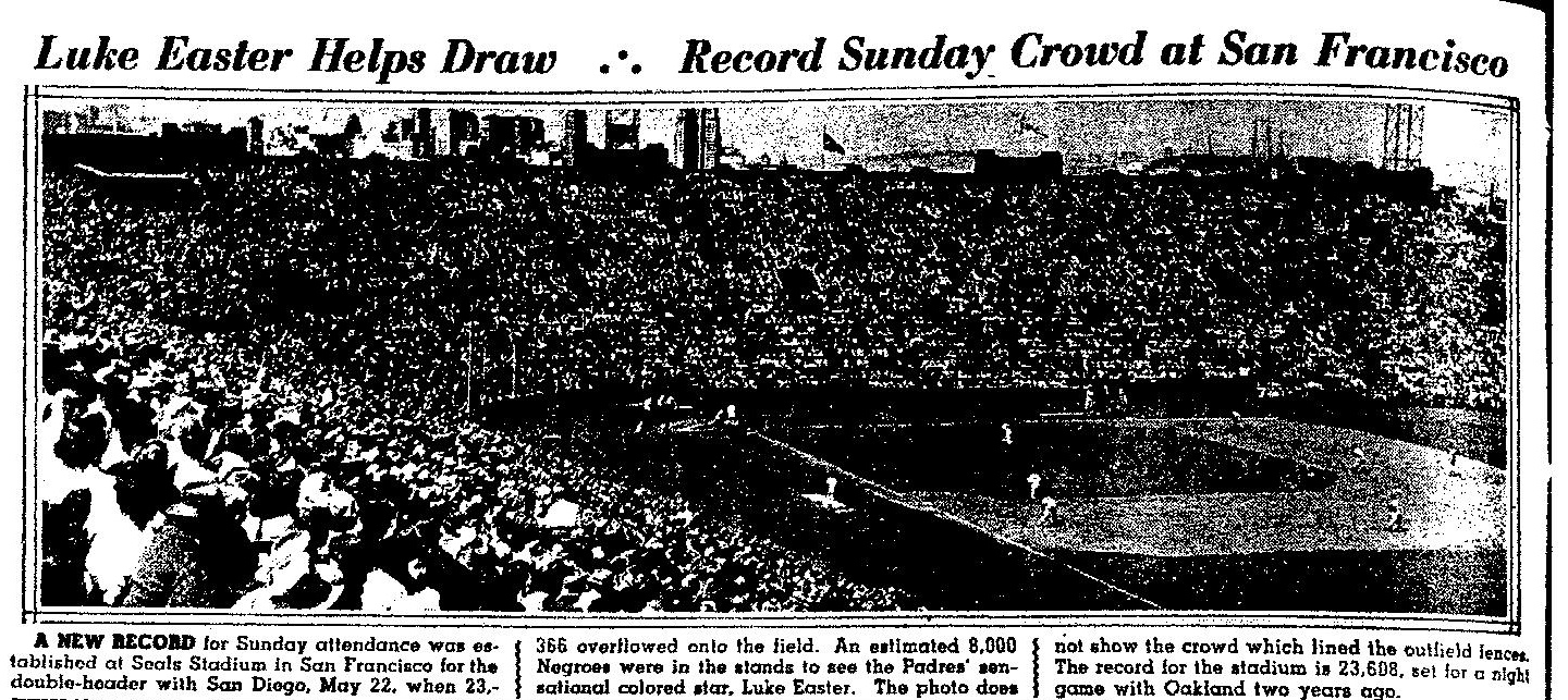 May 22, with the Padres in San Francisco for a Sunday double header against the Seals (in the former House of DiMaggio), 23,366 fans showed up. In addition, it was reported that more than 5,000 were turned away and another thousand stood on car tops to peer over the walls. It was the largest Sunday crowd in PCL history. While the papers stated that an "estimated 8,000 Negroes were in the stands to see the Padres' sensational colored star, Luke Easter," that left almost 16,000 non-Negroes in the stands, no less enthusiastic to see Luke. His appeal crossed all boundaries.