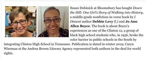 How the months roll by! The book is now in page proofs, with a new title: This Promise of Change: One Girl’s Story in the Fight for School Equality. And it has a gorgeous cover with artwork by the talented, award-winning Ekua Holmes. I love it so much I am setting it out here as big as I can make it. At the front of the line of teenagers pictured here is co-author Jo Ann Allen Boyce. Her eleven classmates (together they were known as the Clinton 12) are there, too; notably, her best friend from high school–and still her friend today, now that they are in their 70s–Gail Ann Upton Epps, in the pink sleeveless blouse, wearing glasses. I can’t wait for you to meet them on the page when the book is released on January 8, 2019.