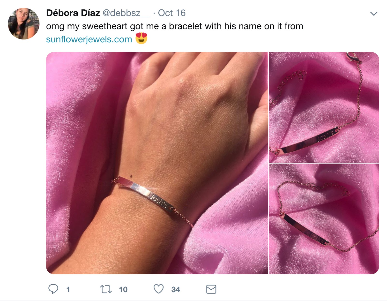 I guess it's possible that, whoever 'Learn Languages' is, they just happen to think that Rubie Rosas comment about the necklace received by Débora Díaz is worth retweeting for its, um, sass(?)... but I doubt it. And I doubt the sincerity of the original tweet about the necklace from Débora Díaz because, well, because here she is tweeting about a bracelet her boyfriend, Josh, got her on October 16th. ..