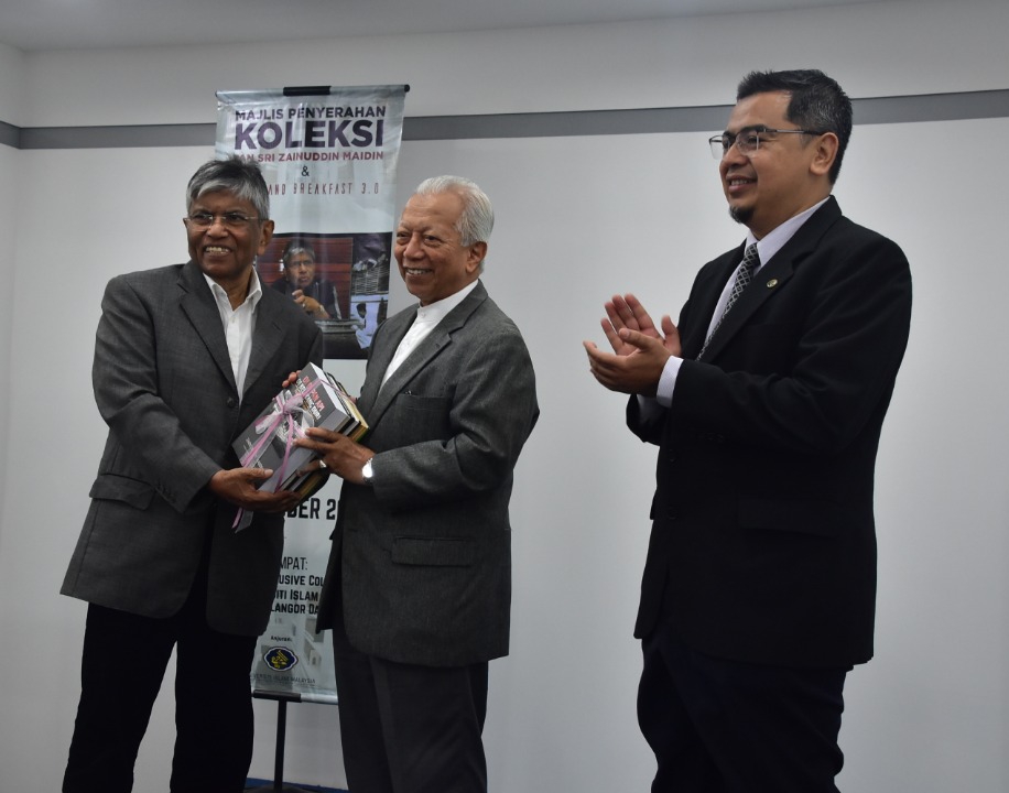 PRESIDEN Universiti Islam Malaysia(UIM) Tan Sri  Mohd Nur Yusuf sedang menerima beberapa buah  buku  sebagai simbolik penyerahan lebih 500 buah koleksi Zam (Zainudin Maidin) kepada UIM. Di kanan sekali Ketua Perpustakaan UIM Encik Azman