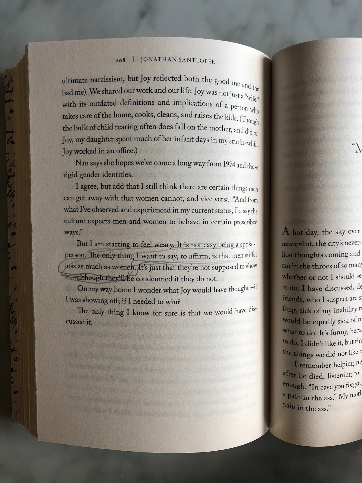 Only a few minutes into Santlofer's book, I felt the pull of Joan Didion's The Year of Magical Thinking. In both cases, there is a married couple, a man and a woman, living in Manhattan, both writers (though Santlofer is also an artist), with separate offices to do their work, and one of the spouses dying suddenly at home. Santlofer even writes, somewhere in the book, "In grandiose moments I could imagine we were Dashiell Hammett and Lillian Hellman or Joan Didion and John Gregory Dunne."