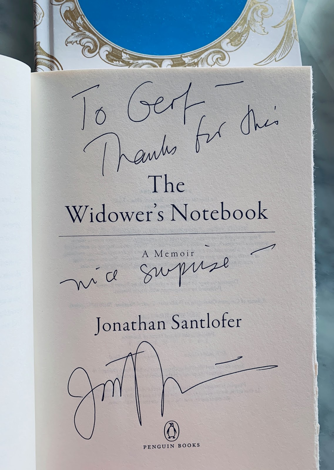 During his opening remarks, Gross recognized his family and friends in the room. One introduction he made piqued my interest. He mentioned a friend who had a successful memoir entitled The Widower's Notebook, said a few words about it, and noted the bookstore had copies of it. I didn't catch the friend's name (something beginning with "San"), but I remembered the title. Jonathan Santlofer was sitting angled in his seat so he could see his friend talking, his left arm cocked on the back of the chair, and he waved off the compliments with his right hand. He seemed genuinely a bit embarrassed by the attention during his friend's rightful time in the spotlight. He had a quiet gentleness to him. He seemed, maybe, to continue to carry the weight of his own story.