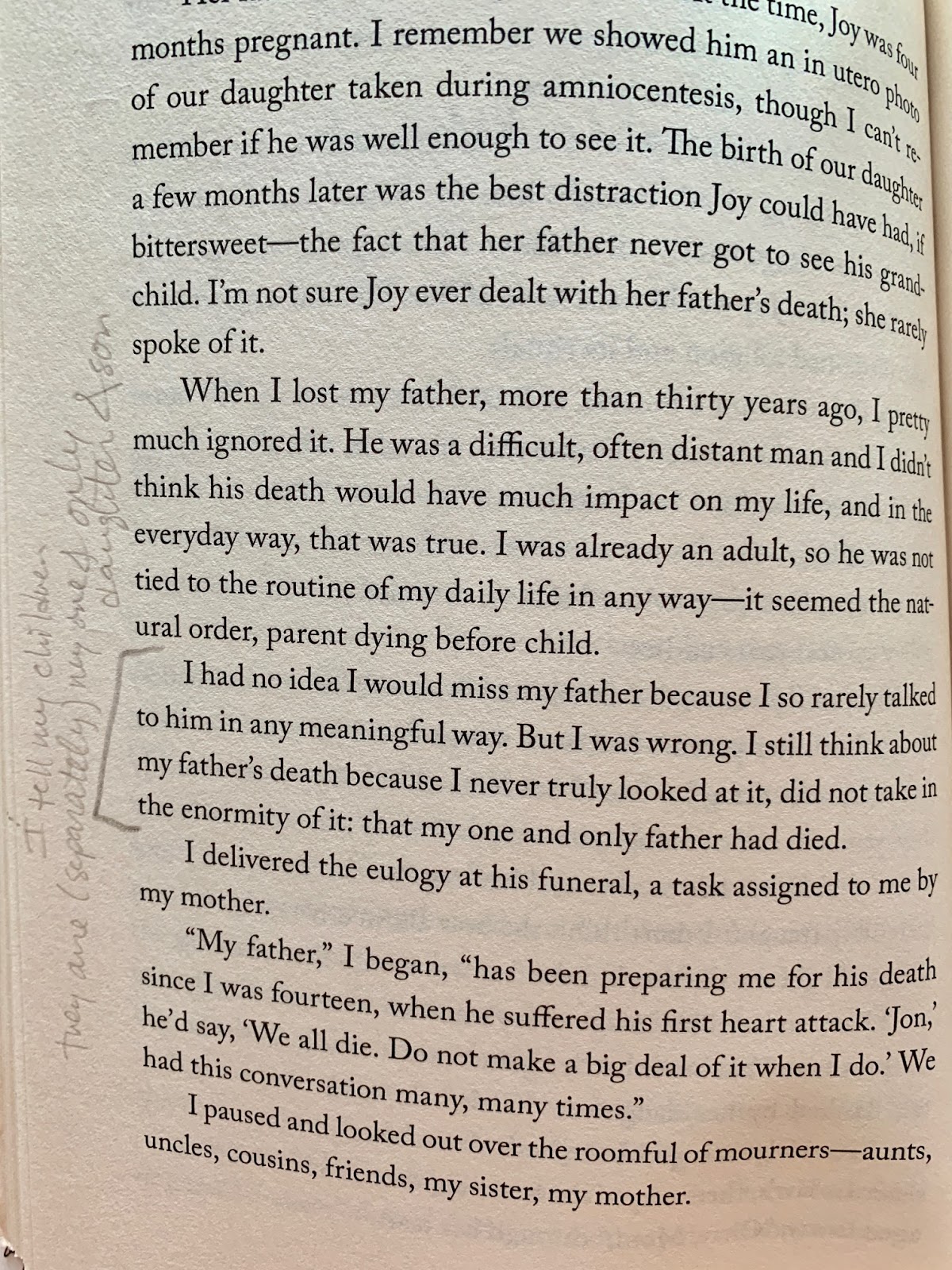 A central part of the book is a secondary loss, the missing autopsy that might explain how he lost Joy, that might help him make sense of a world that no longer makes sense. We learn early that he will wait two years for those results. The foreshadowing isn't a shadow; it is a rock. He will battle--his verb--the surrogate's court for two years. I work about 40% of my time in that building, so I have become a part of his story, an accessory after the fact. I cannot extricate myself from the story. I read 75 pages a day, until four days later I am released.