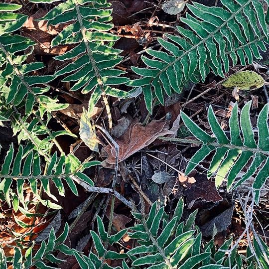 Sword fern, alder and maple leaves, sticks, frost