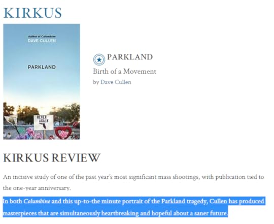 The first review just came in for Parkland: Birth of a Movement, and it's a starred review, from one of the 4 major advance-review pubs, Kirkus.The last time Kirkus awarded a star for nonfiction was Nov 1! That will be 3 months when its Parkland review appears in their Feb. 1 print edition. (Just posted online.)Kirkus defines a starred review as: "Awarded to Books of Exceptional Merit."