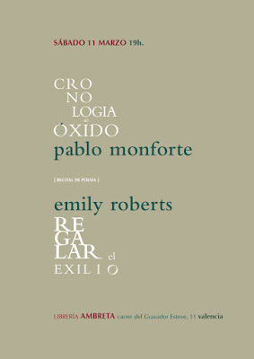 El próximo sábado 11 de marzo a las 19:00Llibreria Ambreta (Carrer del Gravador Esteve 11)Recital junto a Pablo Montforte, autor de Cronología del óxido (Harpo, 2015).
