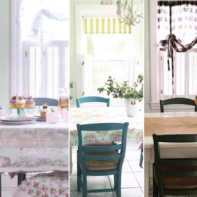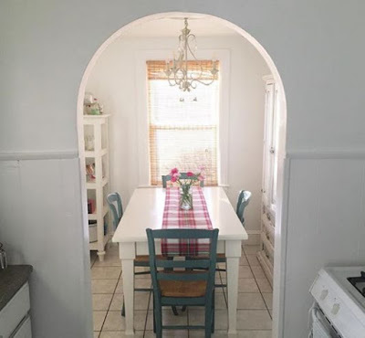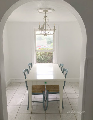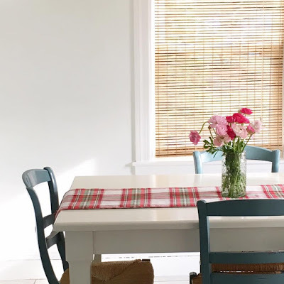 Ever the fickle decorating pickle, I'd been switching accents around in my dining room, most notably the window treatments and table coverings. Shabby Chic valances and a lace window panel; roller blinds striped with Frog tape for the IKEA book paired with yardage of floral cotton; and finally black and white checked valances with a section of brown kraft paper. Despite the look from varying exposures, always the white table, always the smoke blue Isabella dining chairs, and always the Spring Morn-painted walls. I always adored the dining decor but suddenly it seemed fussy.