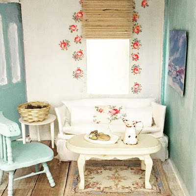 Even a room in Dollhouse no. 2 received a test make-over with a white accent wall and matchstick blinds fashioned from toothpicks. I was ready for this change. Down came the valances and wall decor of the real kitchen and dining room, and in came buckets of pure white; painting was completed toward the end of September.