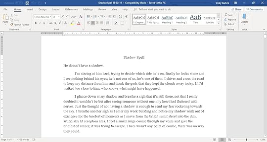 Here I am at the weekend again and giving an overview of the writing I've done this week. So I've still been working on Shadow Spell and I'm currently at just under 5,000 words. Given that I had originally been considering the short story would be about 5,000 words total and I'm only about halfway through, I don't think that's going to happen.So I'm looking now to make Shadow Spell around 10,000 words and I actually think that's more achievable for the type of story that I'm doing. Today I've written just under 2,000 words, which I'm quite pleased with though I do now feel a little like my brain is melting...I'm currently feeling really good about this story and I'm hoping others will too. I think I'll be aiming for another 2,000 this week (I'm trying hard not to become overwhelmed with unachievable targets) since I know I can and if I end up writing more than that, then brilliant.If I'm lucky I'll have a first traft finished in a couple of weeks and then I'm going to get a bit of general feedback from some honest friends before I go in for an edit. Once I'm done with this little side project I'm going to work hard at getting back to Awakened Magic as I'd really love to have it out by Christmas (though that might be wishful thinking). I guess I'll just have to see how I get on.Until then, here's a screenshot of the first bit of Shadow Spell for you to enjoy: