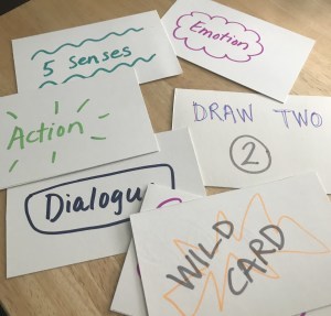 Instead of having generic “5 Senses” cards, you could make one card for each of the five senses.Stack the deck by making more wild cards and adding them at the bottom. This will get you weaned off the cards gradually as you get closer to the end of the deck.Play a round-robin storytelling game with your friends where each person in turn has to draw a card and add that kind of sentence to the story. Use this game in a writing workshop to teach narrative weave.Make additional cards that are more difficult or more subtle, such as Mood, Tone, Theme, Foreshadowing, or anything else that fits with your writing style.