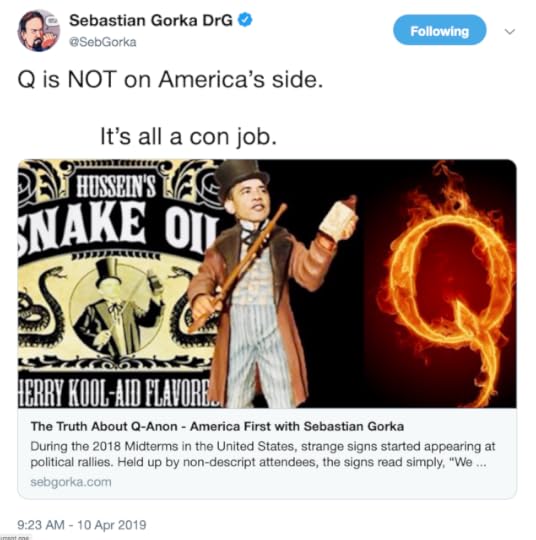 On April 10, 2019, Dr. Gorka tweeted "Q is NOT on America's Side. It's all a con job."