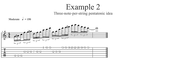 The three-note-per-string pentatonic scales were very popular choices for string skipping. The first person I heard use string skipping with the three-note-per-string pentatonics was Paul Gilbert, but I learned later that Holdsworth was doing this much earlier. Here are several examples that illustrate string skipping: