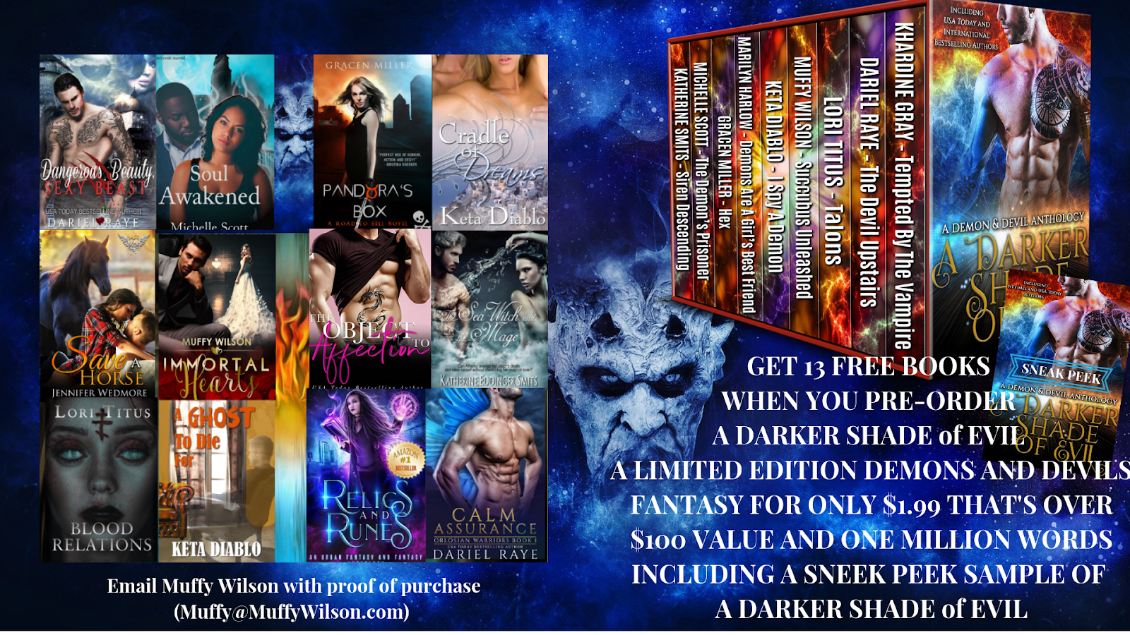 Feb 2019 ~ Flame of Hunger a steamy, sexy romance novellaFeb 2019 ~ Relics & Runes Boxed Set featuring Dark Verité Mar 2019 ~ Muffy Wilson with Dariel Raye featuring Devil’s ClaimJuly 2019 ~ Shadow Seduction Sequel to The Para-Portage of EmilyAug 2019 ~ Ribbons of Moonlight Sequel to Moonbeams of Unintended ConsequencesSept 2019 ~ A Darker Shade of Evil Boxed Set featuring Succubus Unleashed
